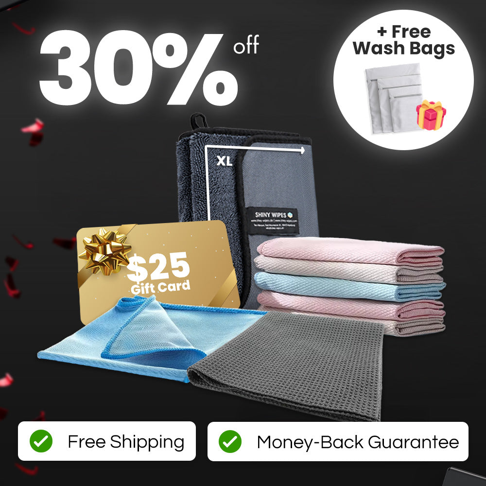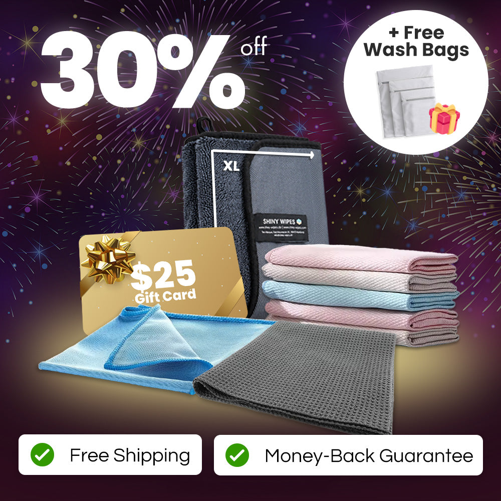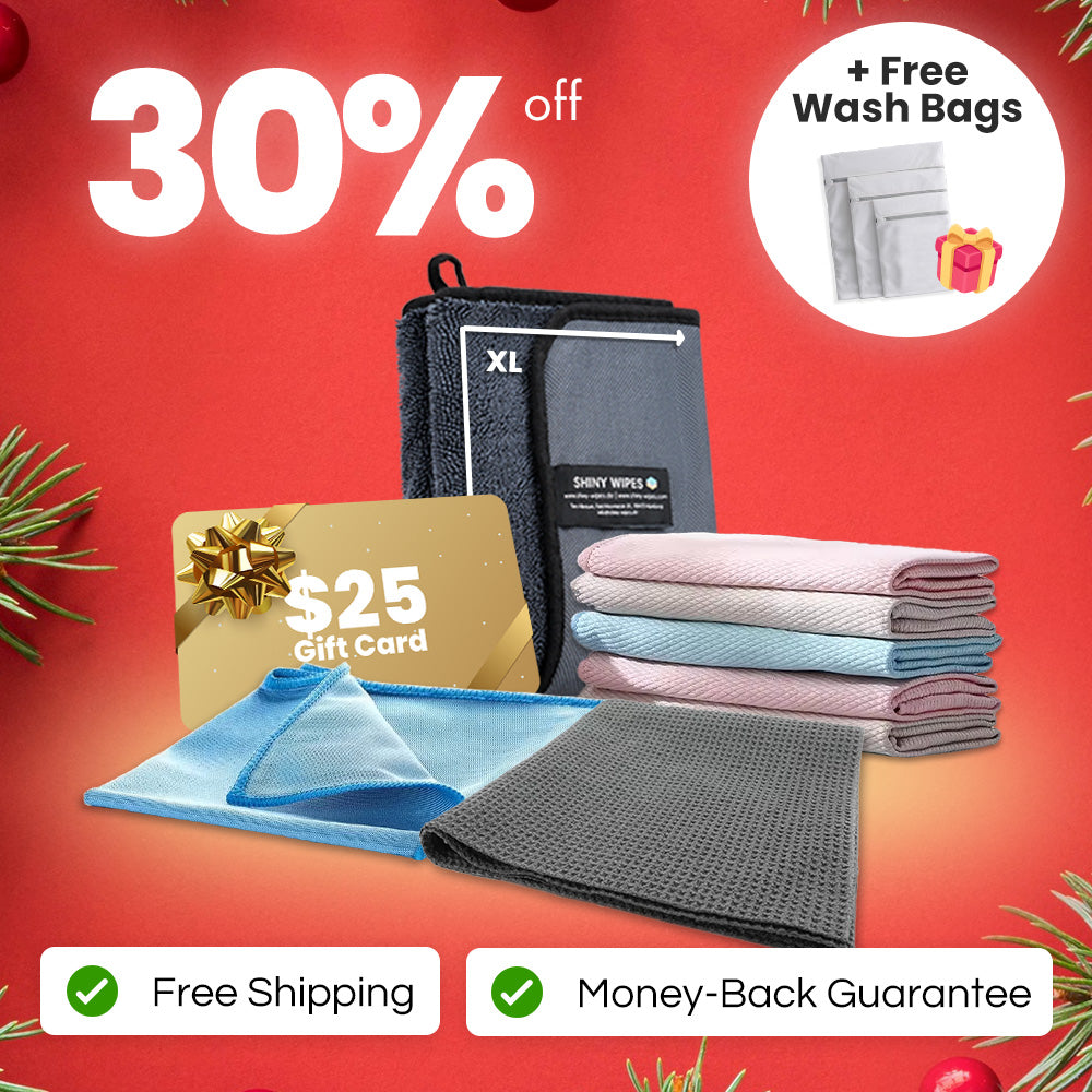 Everything you need to clean, dry, and polish your home to a sparkling shine. The Dry & Shine Bundle includes our Shiny Bath™ XL Drying Towel, a set of 5 All-Purpose Cloths, the XL Window Cloth, and the Glass Polishing Cloth - plus a $25 USD Shiny Wipes™ gift card! Get 30% off compared to buying individually, plus enjoy free shipping, a 30-day money-back guarantee, and a free set of washing bags to keep your cloths in top shape.