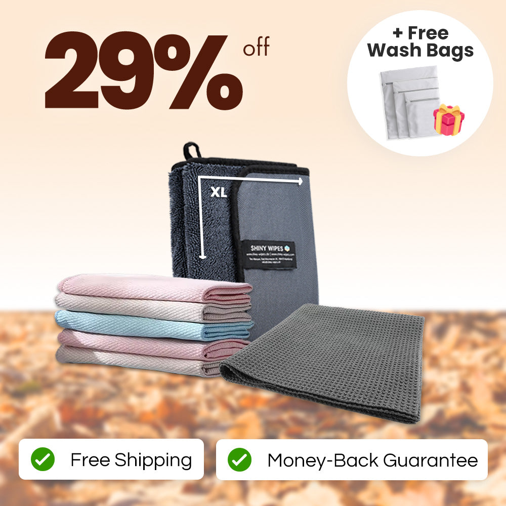 Everything you need for a spotless, streak-free shower without the hassle! The Spotless Shower Bundle includes our bestselling Shiny Bath™ XL Drying Towel, a set of 5 Shiny Wipes™ All-Purpose Cloths, and the XL Window Cloth for crystal-clear glass. Get 29% off compared to buying individually, plus enjoy free shipping, a 30-day money-back guarantee, and a free set of washing bags to keep your cloths in top shape.